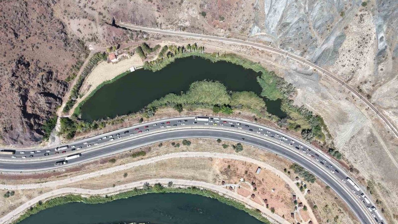 43 ilin geçiş güzergahı Kırıkkale’de, yol yapım çalışmaları nedeniyle trafik durma noktasına geldi. Uzun araç kuyruklarının oluştuğu karayolu dron ile görüntülendi.