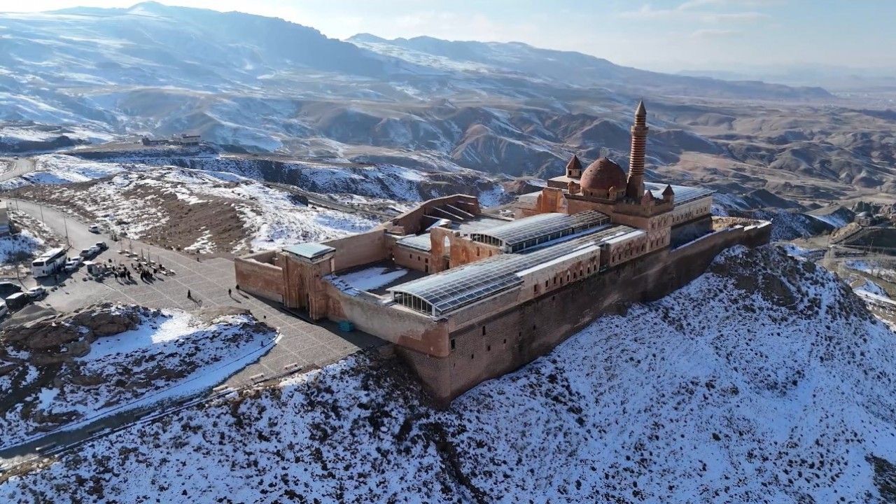 Ağrı’da bulunan ve Osmanlı döneminin en önemli yapılarından biri olarak kabul edilen tarihi İshak Paşa Sarayı, dron ile görüntülendi.