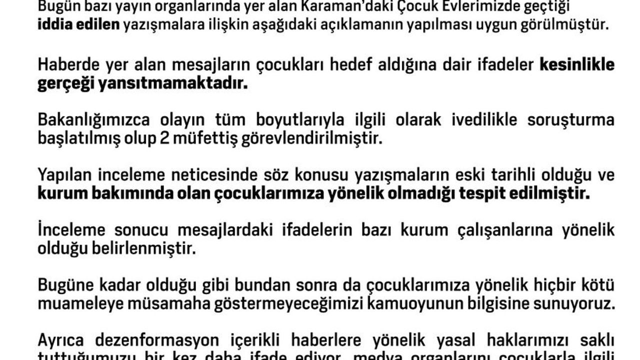 Aile ve Sosyal Hizmetler Bakanlığı, bazı basın yayın organlarında yer alan ve Karaman’daki çocuk evlerinde geçtiği iddia edilen yazışmalara ilişkin açıklama yaptı. Yapılan açıklamada, "Haberde yer alan mesajların çocukları hedef aldığına dair ifadeler kesinlikle gerçeği yansıtmamaktadır. Bakanlığımızca olayın tüm boyutlarıyla ilgili olarak ivedilikle soruşturma başlatılmış olup, 2 müfettiş görevlendirilmiştir. Yapılan inceleme neticesinde söz konusu yazışmaların eski tarihli olduğu ve kurum bakımında olan çocuklarımıza yönelik olmadığı tespit edilmiştir. İnceleme sonucu mesajlardaki ifadelerin bazı kurum çalışanlarına yönelik olduğu belirlenmiştir. Bugüne kadar olduğu gibi bundan sonra da çocuklarımıza yönelik hiçbir kötü muameleye müsamaha göstermeyeceğimizi kamuoyunun bilgisine sunuyoruz. Ayrıca dezenformasyon içerikli haberlere yönelik yasal haklarımızı saklı tuttuğumuzu bir kez daha ifade ediyor, medya organlarını çocuklarla ilgili haberlerde gerekli hassasiyet ve özeni göstermeye davet ediyoruz" ifadelerine yer verildi.