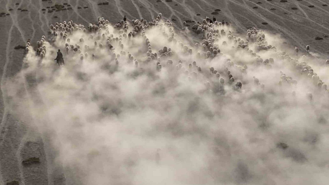 Gün batımına doğru dron ile kaydedilen görüntülerde sürünün ilerleyişi adeta bir tabloyu andırdı. Koyunlar, nizami bir şekilde sıralanarak ağıllarına doğru ilerlerken, oluşan toz bulutlarıyla birlikte görsel bir şölen sundu. Çobanın telaşı da kimi zaman sürünün kimi zaman sürünün yanında görüntülere yansıdı.