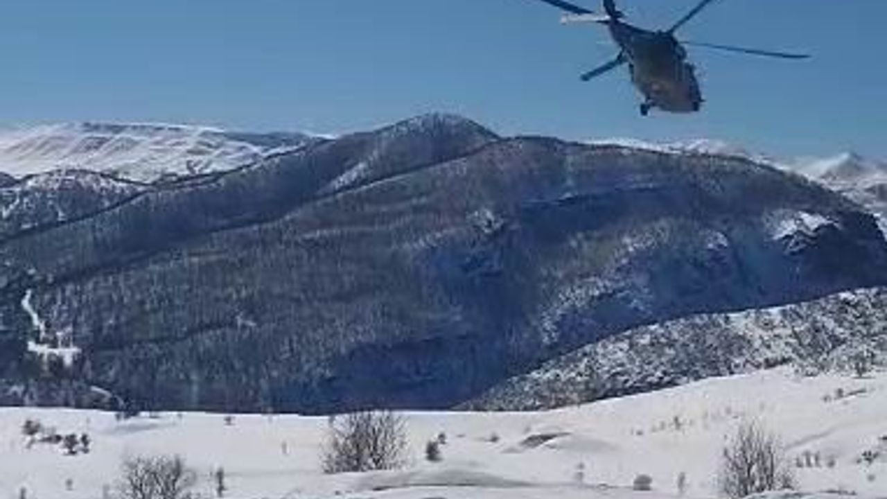 Tunceli’nin Hozat ilçesinde çetin kış şartları nedeni ile hayvanlarına yem getiremeyen çiftçinin yardımına askeri helikopter yetişti. Dağlık araziye inen helikopter, çiftçiye hayvanları için yem bıraktı.