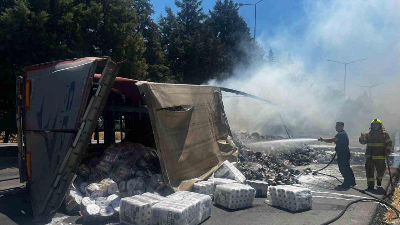 Balıkesir’de İstanbul istikametinden gelen market malzemesi yüklü tırın tek taraflı karıştığı kaza sonrası çıkan yangın, yolun dışında bulunan otlara sıçradı. İtfaiye ekipleri hem tır hem de ot yangınına müdahale etti.