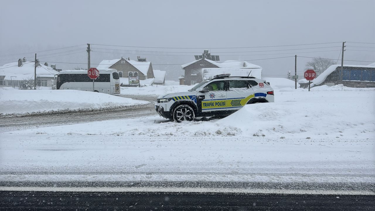 Yoğun kar yağışı nedeniyle ağır tonajlı araçların sürücüleri, buradaki kavşaktan geri döndürülüyor.