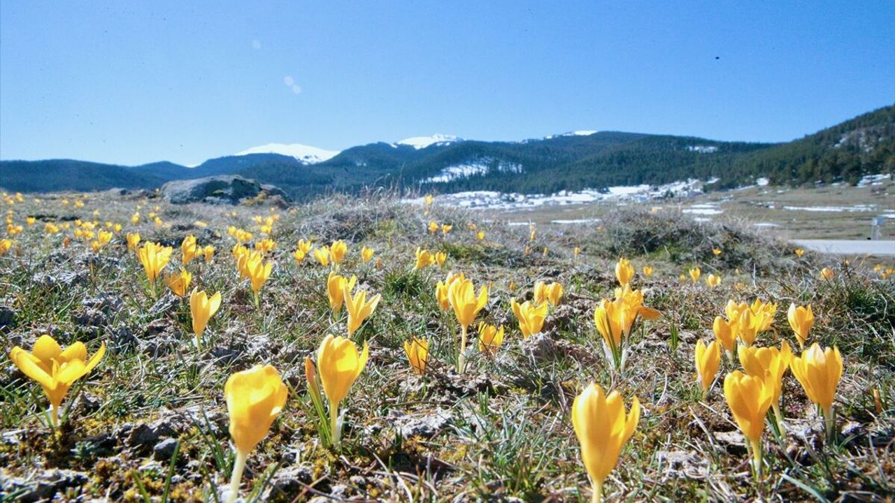 Sarı ve mor renkteki çiğdemlerin oluşturduğu güzel manzaraya, yüksek kesimlerde yer yer varlığını koruyan kar örtüsü eşlik etti.