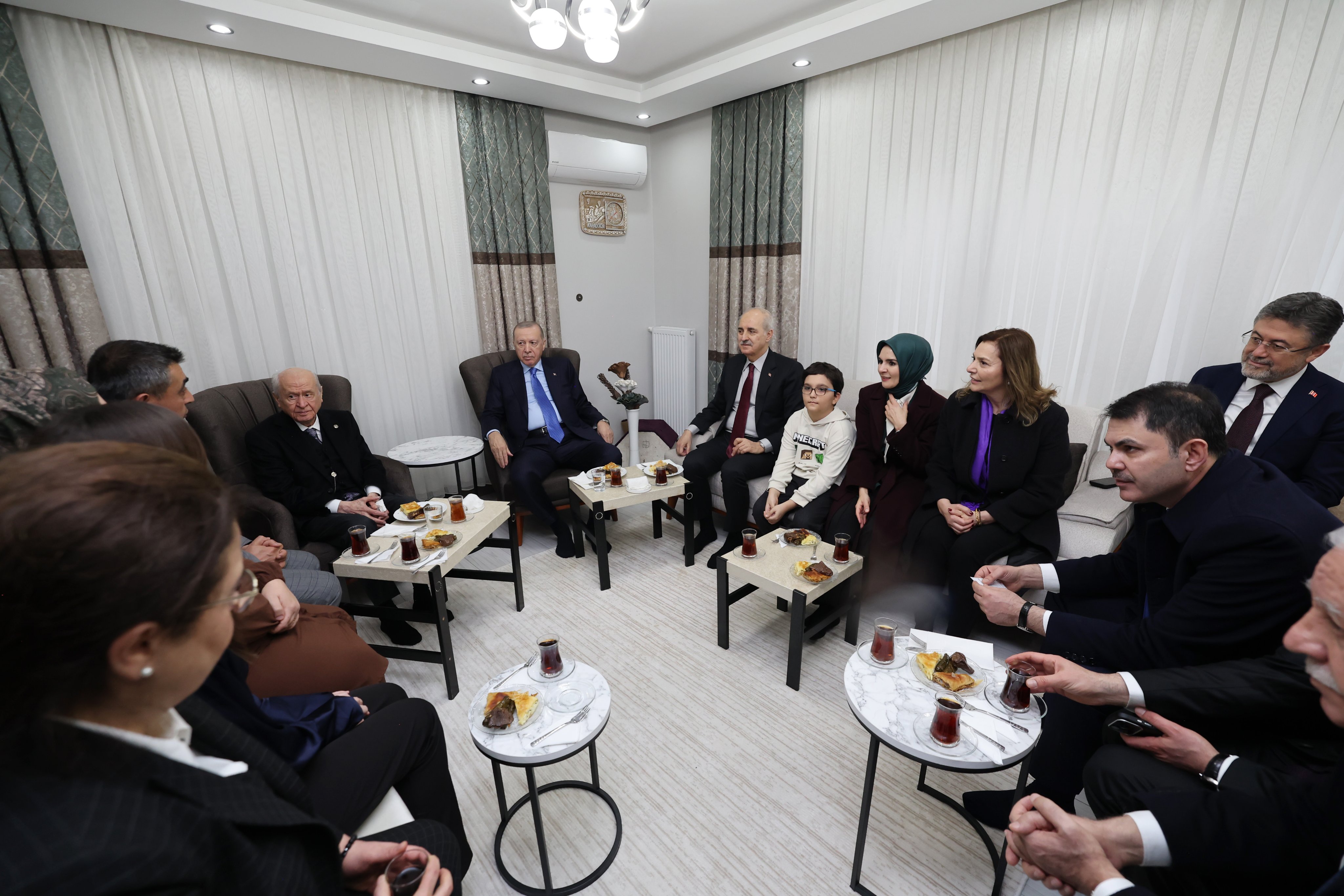Törenin ardından Cumhurbaşkanı Erdoğan’a; MHP Lideri Devlet Bahçeli ve TBMM Başkanı Numan Kurtulmuş eşlik etti. Devletin zirvesi, depremzede Hidayet Solak ve ailesini yeni konutlarında ziyaret etti. Sıcak bir atmosferde gerçekleşen ziyarette aile üyeleriyle sohbet eden Cumhurbaşkanı Erdoğan, deprem konutlarındaki yaşam ve ihtiyaçlar hakkında bilgi aldı.