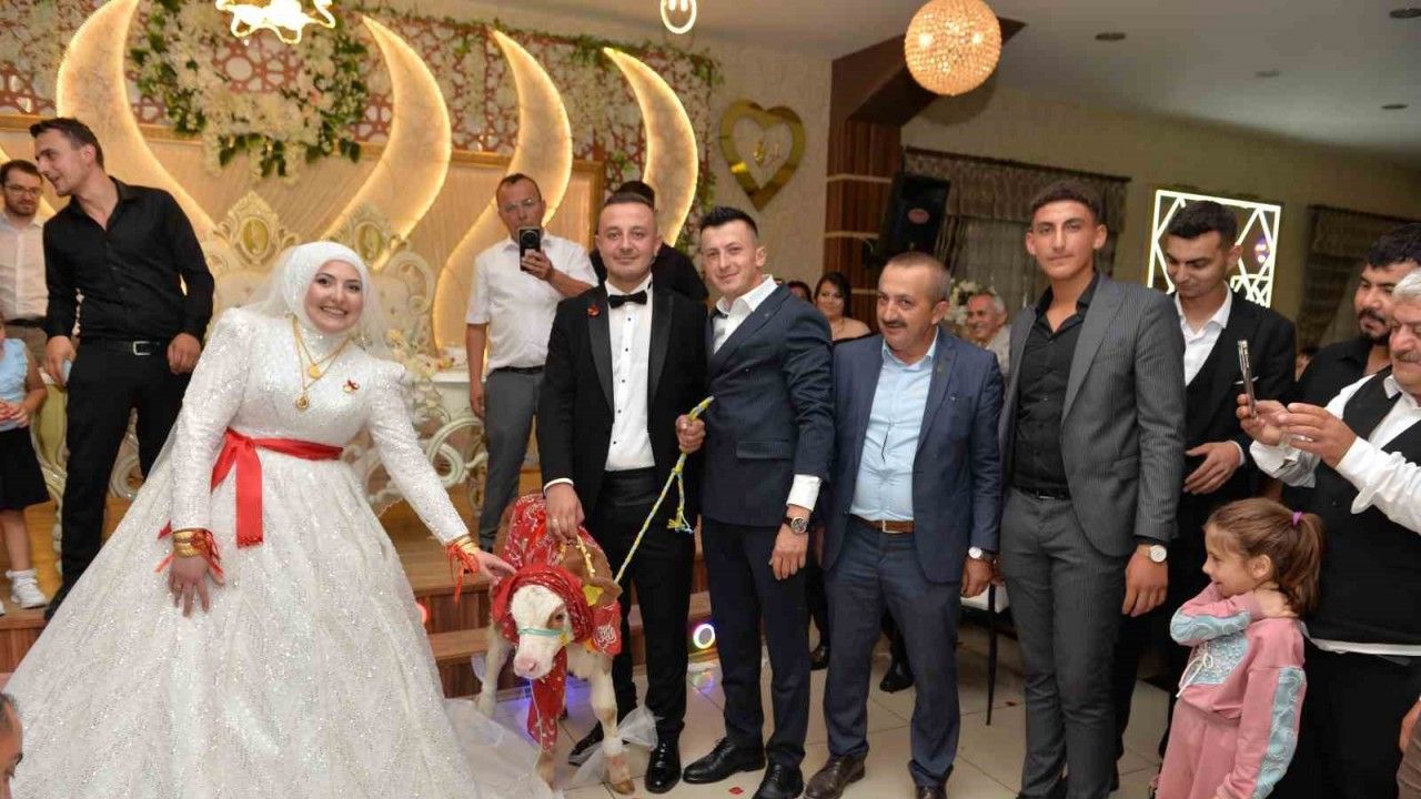 Kent merkezinde ikamet eden Saliha Yaman ve Musa Yaman çifti, düzenlenen düğün töreniyle dünyaevine girdi. Damat Musa Yaman’ın dayısı Gazi Salih Dıkkıloğlu ile kuzeni Emrah Dıkkıloğlu, takı töreninde çifte 3 aylık simental ırkı buzağı hediye etti. Gelin Saliha ve Damat Musa Yaman, kendilerine düğün hediyesi olarak verilen buzağıyı biberonla besleyerek süt içirdi.