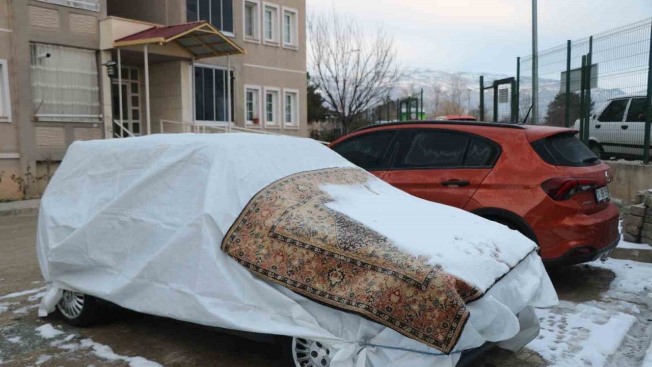 Erzincan’da araçlarının soğuk havalardan etkilenmesini istemeyen bazı vatandaşlar halı, naylon, karton ve battaniye ile koruma tedbiri alıyor.