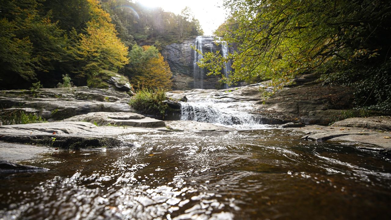 Sonbaharda yeşil ve sarının tonlarıyla ziyaretçilerini karşılayan şelale, dronla da havadan görüntülendi.