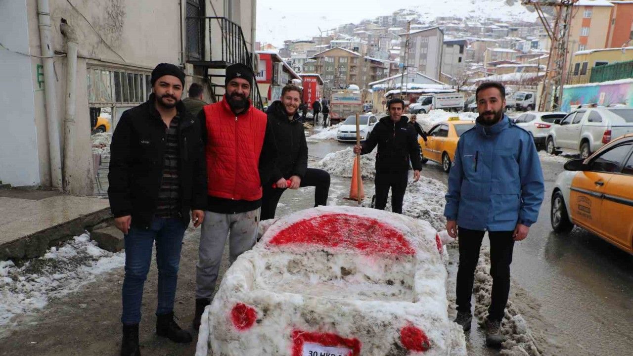 Hakkari’de kar yağışı sevinici yaşayan esnaf, kardan araba yaptı.