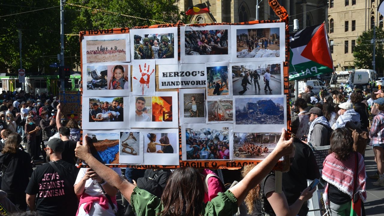 Filistin'i destekleyen göstericiler, Melbourne'ü ziyaretine karşı çıktıkları Herzog'un Gazze'de soykırımı reddetmesine ilişkin ifadelerine tepki gösterdi.