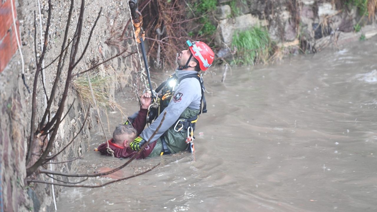 Bölgeye yönlendirilen itfaiye ekipleri, su seviyesinin yaklaşık 2 metreye ulaştığı dereye vinç yardımıyla indi.