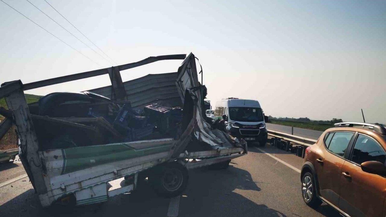 Osman Ü. (43) idaresindeki 16 YV 733 plakalı kamyonet aynı yönde seyreden Sait B. yönetimindeki 63 AGN 117 plakalı kamyona arkadan çarptı. Kamyonette bulunan sürücü Osman Ü. yaralı olarak Karacabey Devlet Hastanesi’ne sevk edildi.