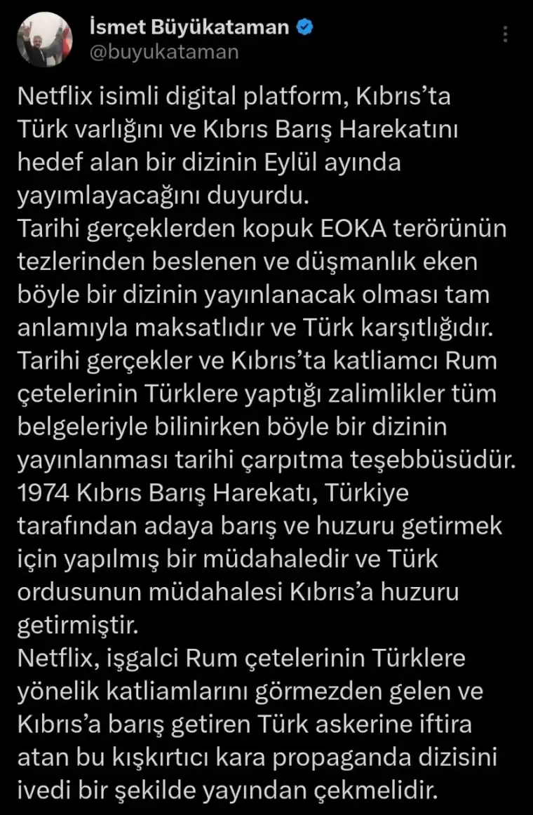 MHP Genel Sekreteri İsmet Büyükataman Netflix'te Kıbrıs Barış Harekatı'nı hedef alan ve Rum tarafının propagandasını yaptığı belirtilen diziye tepki gösterdi. "Tarihi gerçekler ve Kıbrıs’ta katliamcı Rum çetelerinin Türklere yaptığı zalimlikler tüm belgeleriyle bilinirken böyle bir dizinin yayınlanması tarihi çarpıtma teşebbüsüdür." dedi.