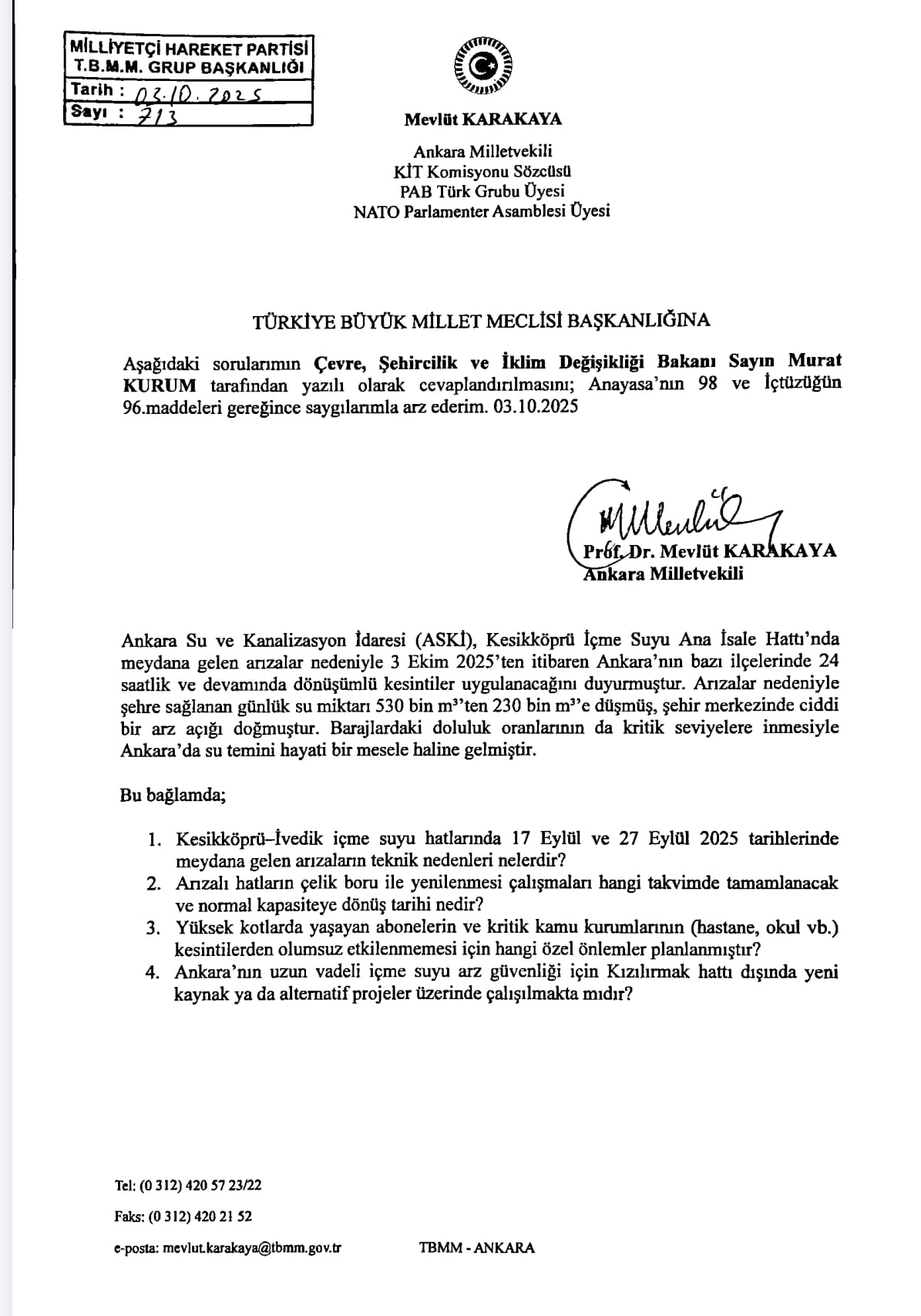 Karakaya, önergesinde suyun “medeniyetin damarlarında dolaşan hayat kaynağı” olduğuna vurgu yaparak, “Başkentte bir damla dahi ziyan edilmemeli, su yönetimi stratejik bir mesele olarak ele alınmalıdır.” ifadelerine yer verdi.