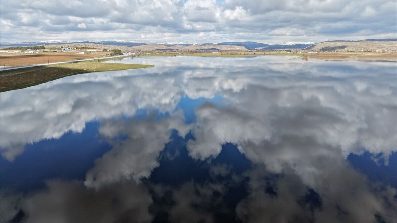 Göl ile bölgedeki Yarhisar, Dışkapı ve Durulmuş köyleri arazisinde yaklaşık 15 kilometrelik hatta oluşan su birikintileri, dronla görüntülendi.