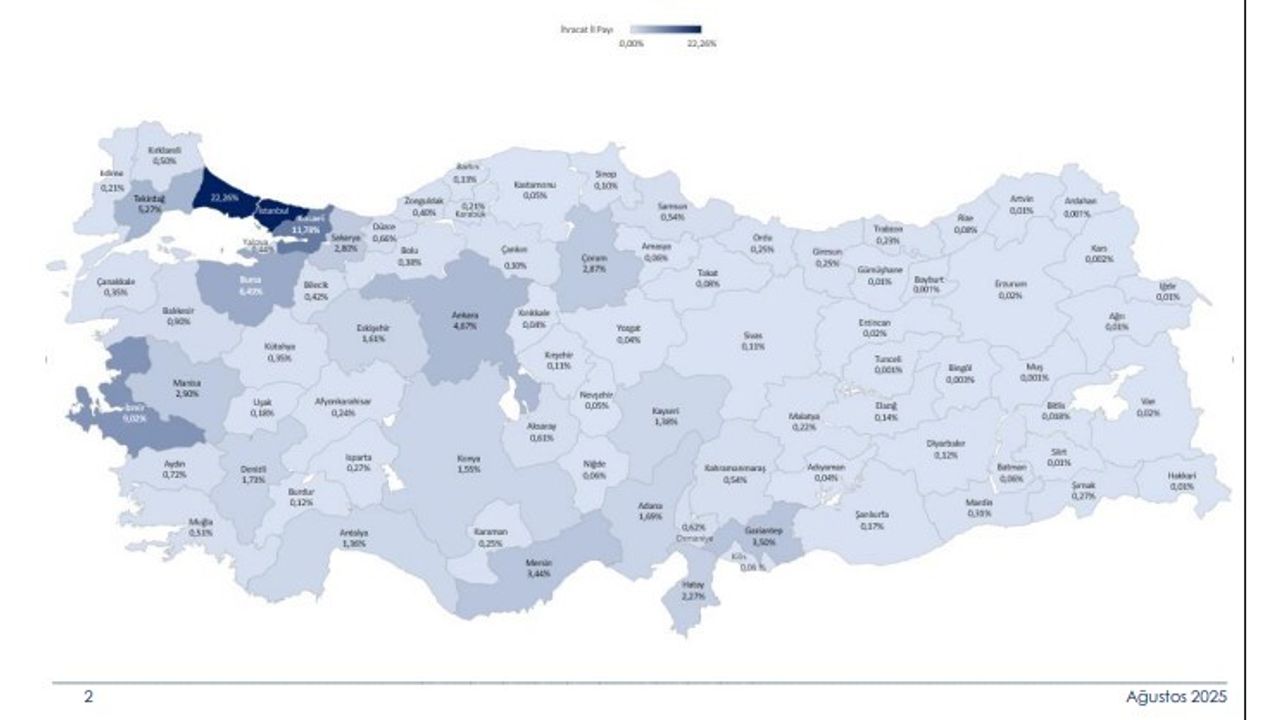 Ticaret Bakanlığı, ağustos ayına ve yılın 8 aylık dönemine ilişkin faaliyet illerine göre ihracat verilerini açıkladı. Buna göre İstanbul, geçen ay 4 milyar 852 milyon dolarla en fazla ihracat yapan il oldu. Kentin ihracatı geçen yılın aynı ayına göre yüzde 0,9 artış gösterdi. İstanbul’u yüzde 9,3 azalış ve 2 milyar 568 milyon dolar ile Kocaeli, yüzde 3,6 artış ve 1 milyar 966 milyon dolar ile İzmir takip etti. 2025 yılı Ağustos ayında ihracatta ilk beşte yer alan iller ise sırasıyla 4 milyar 852 milyon dolarla İstanbul, 2 milyar 568 milyon dolarla Kocaeli, 1 milyar 966 milyon dolarla İzmir, 1 milyar 414 milyon dolarla Bursa ve 1 milyar 150 milyon dolarla Tekirdağ oldu.