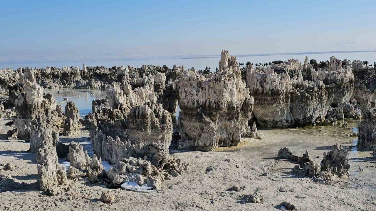 Etkisini her geçen yıl artıran kuraklık, yağışların azalması ve sıcaklıkla birlikte artan buharlaşma sonucu Van Gölü’nde su seviyesi düşmeye devam ediyor. Van Gölü’nün Bitlis’in Adilcevaz ilçesinin kıyı bandında suların çekilmesiyle sahilde yükselen mikrobiyalitler korkunç tabloyu gözler önüne seriyor.