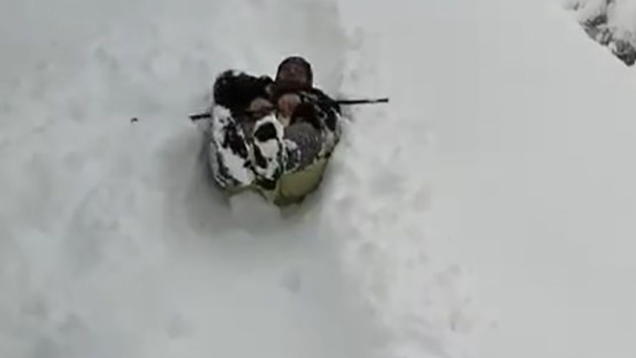 Kastamonu’nun Çatalzeytin ilçesinde 80 santimetreyi bulan kar kalınlığında canı sıkılan teyze, eline aldığı çuvalla kaydı.