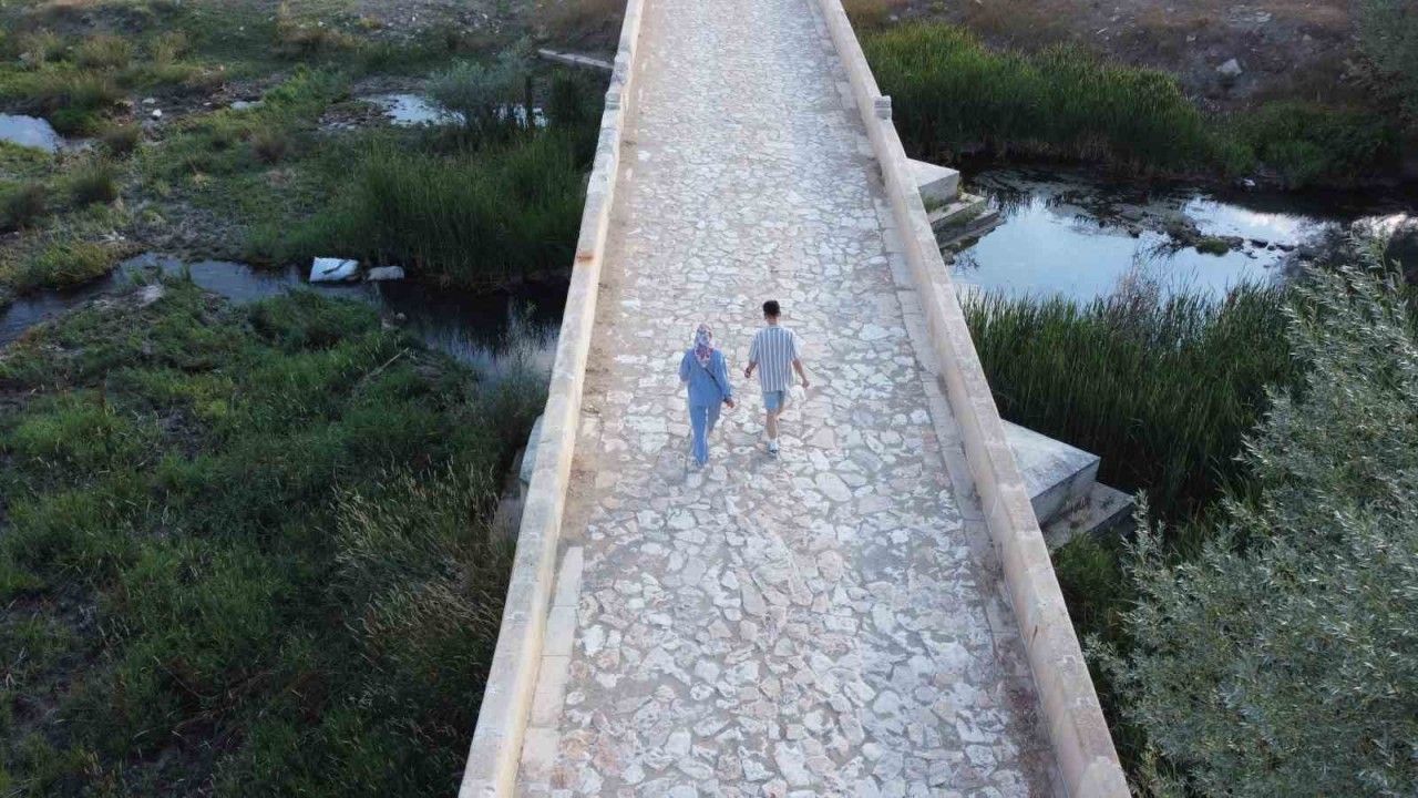 Yozgat’ta 2018 yılında aslına uygun restore edilen, aradan geçen beş asra rağmen varlığını korumaya devam eden Karabıyık Köprüsü, dronla görüntülendi.