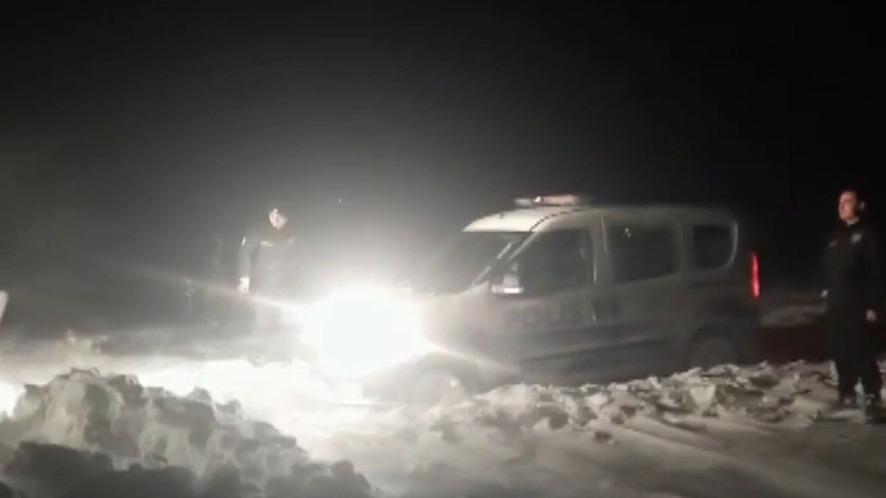 Kahramanmaraş'ta etkili olan kar yağışı ve tipi nedeniyle görevden dönen polis ekipleri yolda kalınca, yardıma kar temizlemede görevli iş makineleri yetişti.
