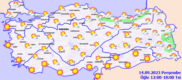 Hava Durumu: Az bulutlu ve açık, Rüzgar: Kuzey Ege'de kuzey ve kuzeydoğudan, öğle saatlerinden sonra kuzeybatıdan 3 ila 5; Güney Ege'de kuzey ve kuzeybatıdan 3 ila 5 açıkları 4 ila 6 kuvvetinde, Dalga: 1,0 ila 2,0 m, güneyinin açıkları yer yer 2,5 m, Görüş: İyi.